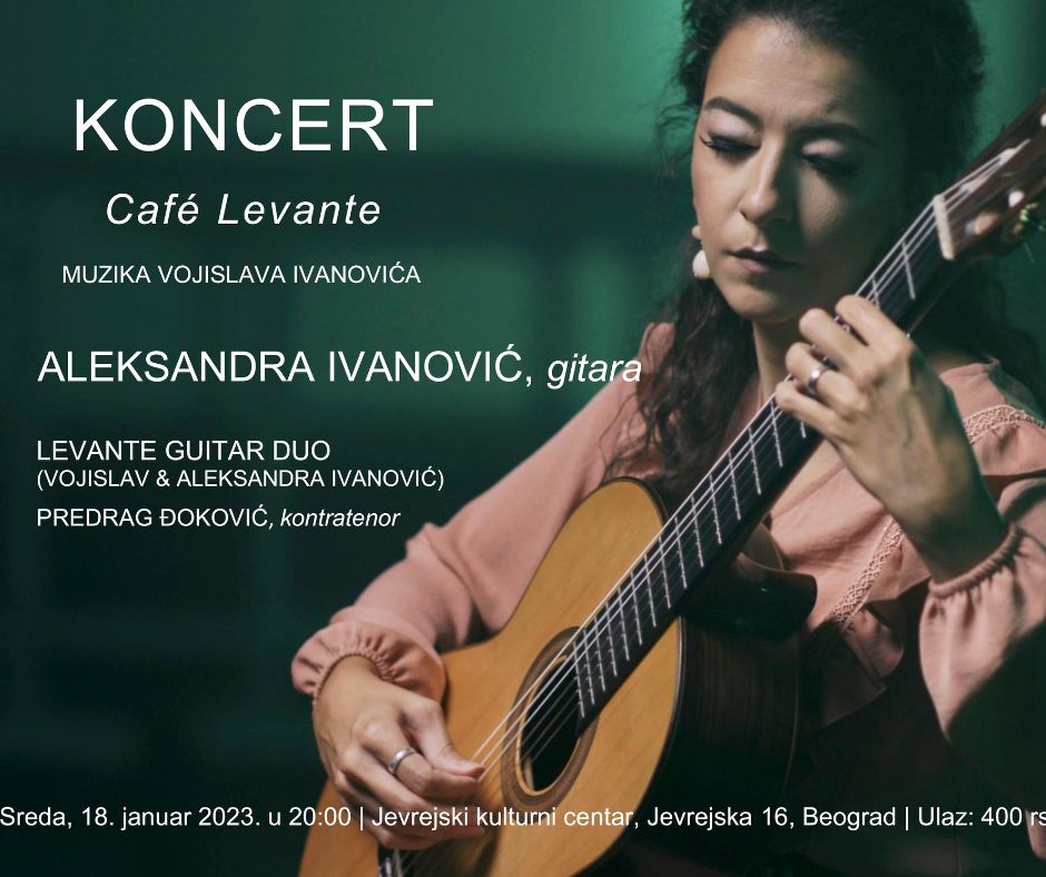 Sreda 18. januar 20:00Cafe Levante - Muzika Vojislava IvanovićaJevrejski kulturni centar, Jevrejska 16U sredu, 18. januara u Jevrejskom kulturnom centru u Beogradu, održaće se koncert muzike svetsk...