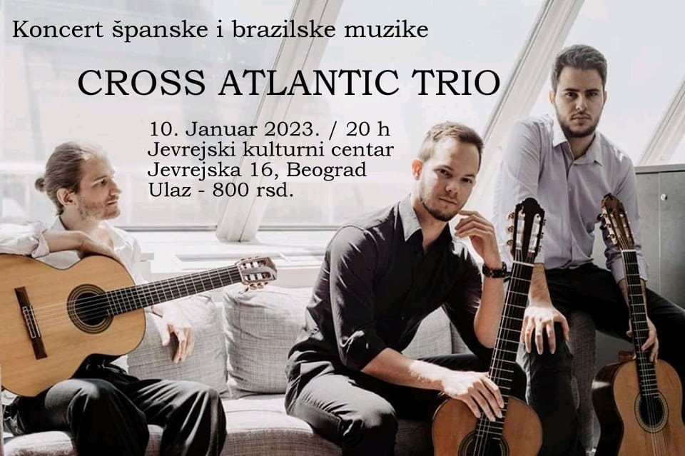 Utorak 10 januar 20:00 časovaJevrejski kulturni centar, Jevrejska 16Koncert Cross Atlantic Trio Koncert španske i brazilske muzike u izvođenju trojice predanih, mladih i afirmisanih gitaris...