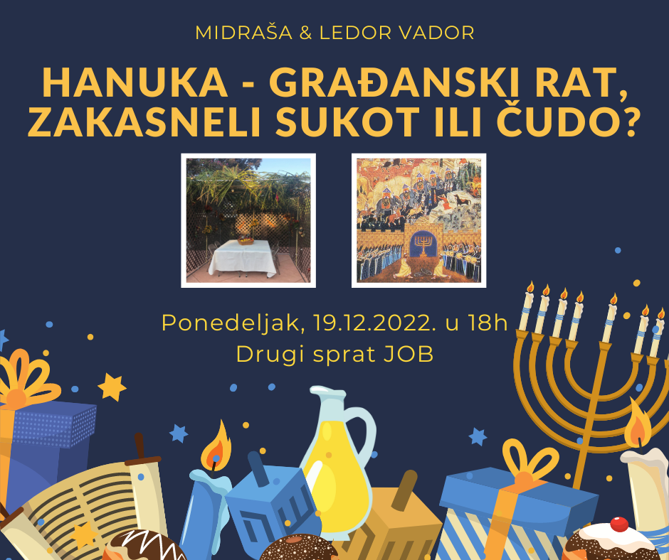 Ponedeljak 19. decembar 18:00Haver radionica “Hanuka - građanski rat, zakasneli Sukot ili čudo?”Jevrejska opština Beograd, Kralja Petra 71a, II spratMidraša druženje i učenje. Radionica “H...