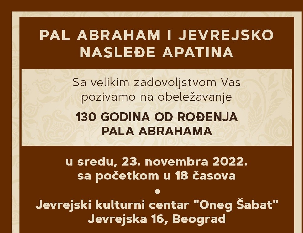 Sreda 23. novembar18:00 Pal Abraham i jevrejsko nasleđe Apatina, Jevrejski kulturni centar, Jevrejska 16Sa velikim zadovoljstvom vas pozivamo na obeležavanje 130 godina od rođenja kompozitora Pala ...