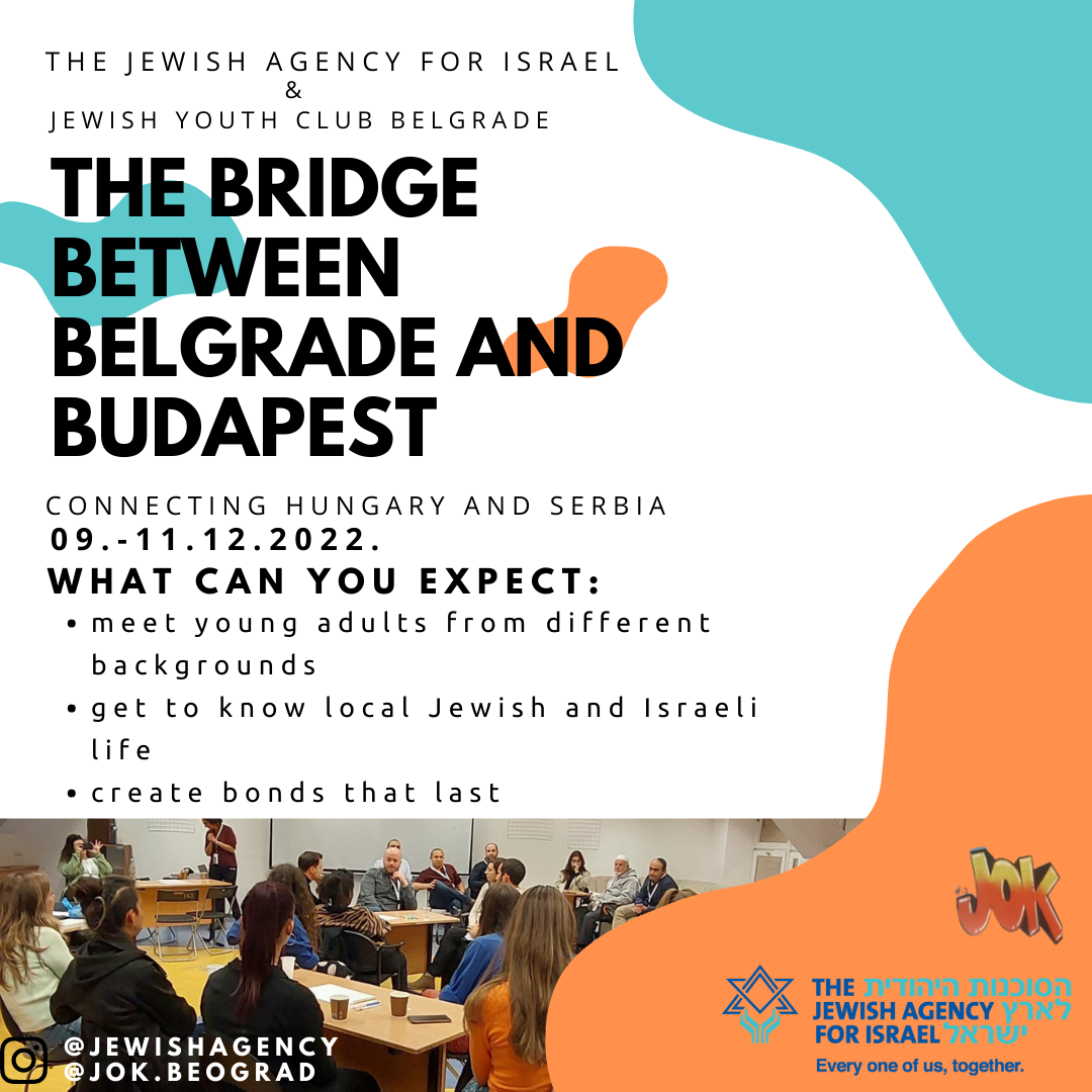 09-11 decembarSusret omladinaca u BudimpeštiU saradnji jecrejskog omladinskog kluba Beograd i The Jewish Agency for Israel u Budimpešti, osmišljen je dvodnevni susret u mađarskom glavnom gradu za ...