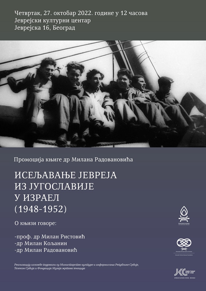 Četvrtak 27. oktobar12:00 Jevrejski kulturni centar, Jevrejska 16Promocija knjige ,,Iseljavanje Jevreja iz Jugoslavije u Izrael, 1948-1952" dr Milana Radovanovića; Knjiga dr Milana Radovanovića iza...