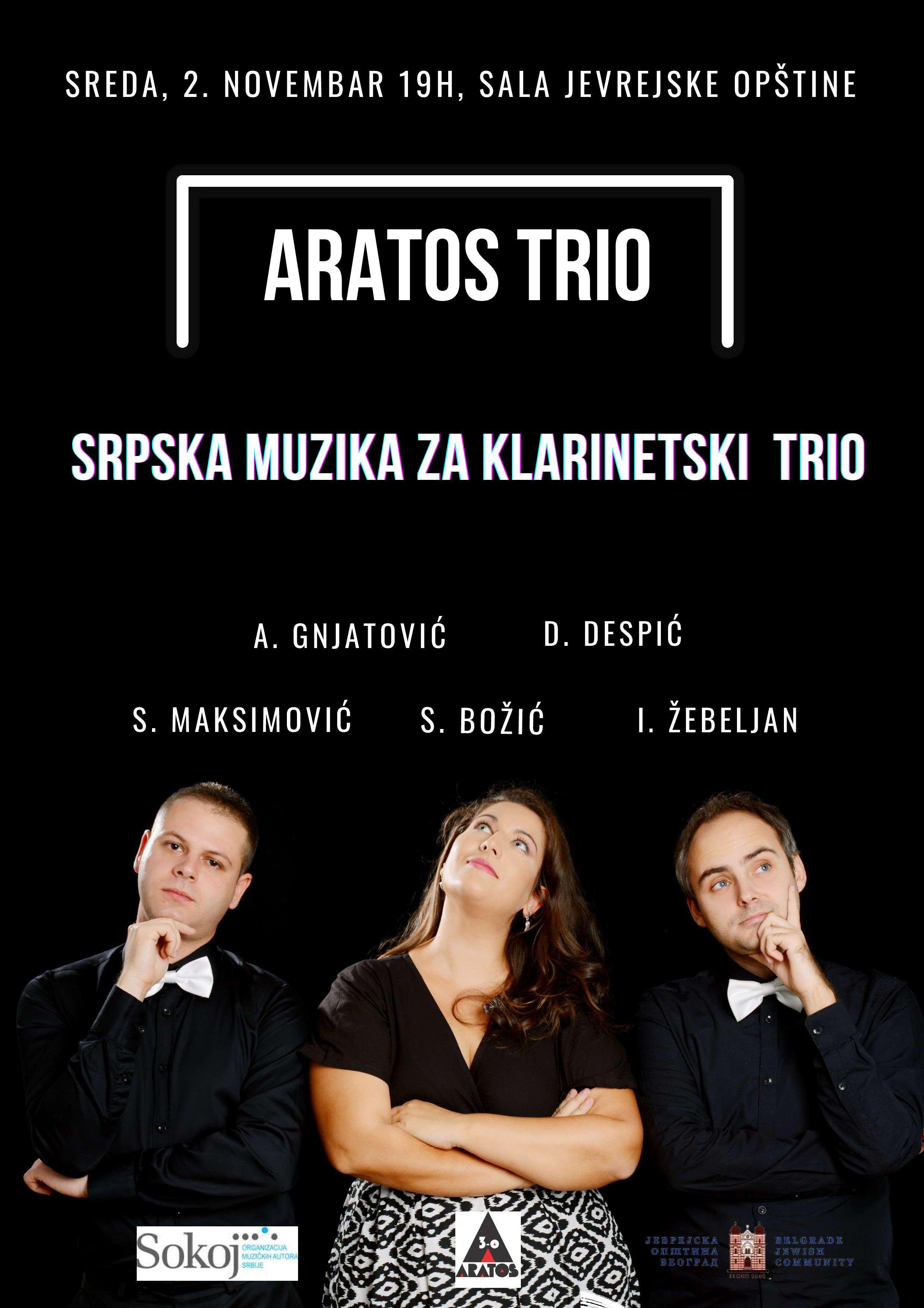 Sreda 02. novembar19:00 Svečana sala Jevrejske opštine Beograd, Kralja Petra 71aU okviru serije koncerata klasične muzike koje organizuje prof. Ladislav Mezei, Aratos trio održaće koncert srpske ...