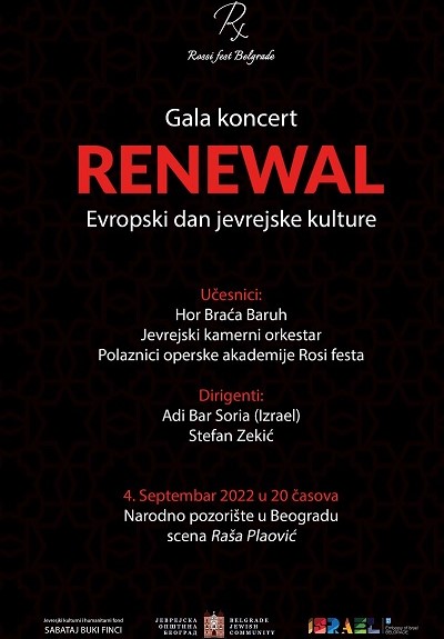 Povodom Evropskog dana Jevrejske kulture 2022, u nedelju 4. septembra u 20 časova u Narodnom pozorištu u Beogradu, scena „Raša Plavović“, održaće se Gala koncert pod naslovom „Renewal“.S...